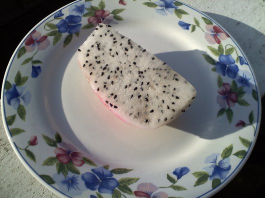 The curiosity is over. I ate it and was disappointed. Expecting it to have the texture similar to radishes – I was told that by someone who loves radishes and had eaten the fruit – I was glad that it didn’t. Distinctly flavorless as a whole, the soft black seeds give it a fun, crunchy feel in your mouth. In fact, if there was an easy way to extract the seeds, that is what I would eat instead. The white pulp around it has a somewhat gelatinous feel, at least when it’s ripe, such as this piece that I ate. As a tropical fruit, however, it has not a biting taste or sweetness that would make it unforgettable to the senses. It may, however, be a perfect diet fruit: I felt full after a couple of slices.